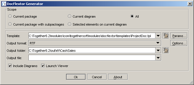 FlexDoc installs itself in the 'Project | Documentation' menu in Together 6.x or Together Architect 1.x (or 'Tools | Documentation' menu in Together 5.x): Launching FlexDoc Template Designer from the Together IDE: Invoking FlexDoc Generator:3. Generator Dialog