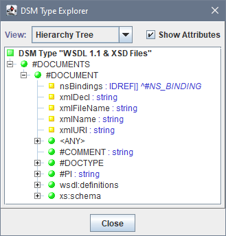 All open XML files are represented together in the form of a single tree structure (similar to XML DOM). That virtual representation, called XML DSM (or XML Data Source Model), in turn, consists of abstract DSM elements and DSM attributes. Some of them mirror real XML elements and attributes found in the open XML files. Others (called pseudo-elements) represent all kinds of non-element/attribute nodes found in XML DOM (such as TEXT-nodes, XML comments, processing instructions etc.) as well as each XML file as a whole. On top of the tree is a special pseudo-element #DOCUMENTS that represents all XML files together.