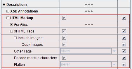 By default (when you've just downloaded FlexDoc/XML and installed it), all settings will be such that any XHTML markup and images in your annotations will be processed and immediately visible in the generated documentation (in both HTML and RTF formats). However, if you changed something, make sure the following settings are set correctly.These template parameters should be selected: