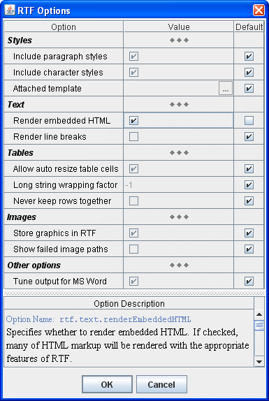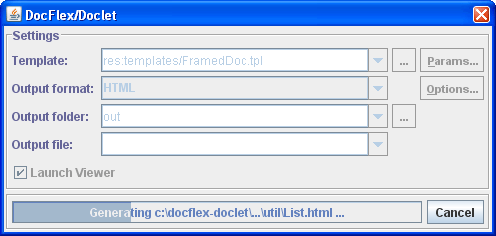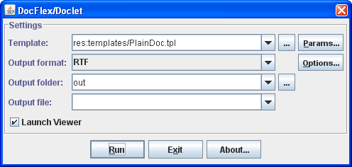 All of those settings can be specified as options on the Javadoc command line. In addition, DocFlex Doclet provides a more user-friendly way of specifying everything using a little GUI. The following screenshots show some dialogs of that GUI (click to enlarge):
