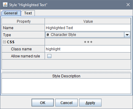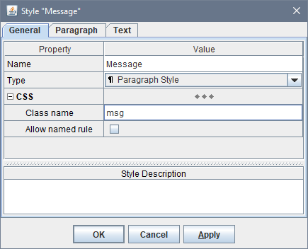 The class name (selector) assigned to a named CSS rule comes from the corresponding template formatting style, by which the rule is generated. The rule class name must be specified with the "CSS | Class name" property in the style definition: