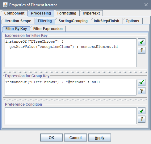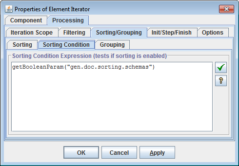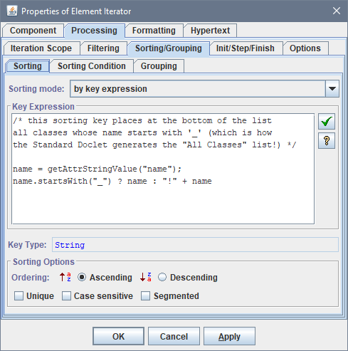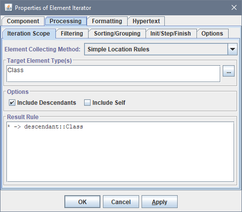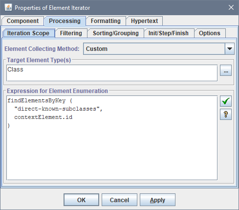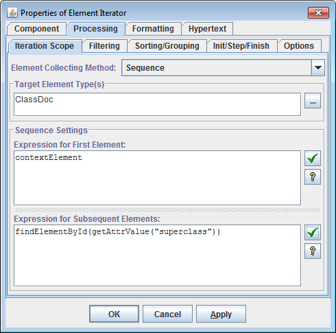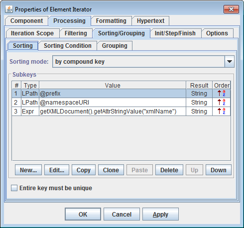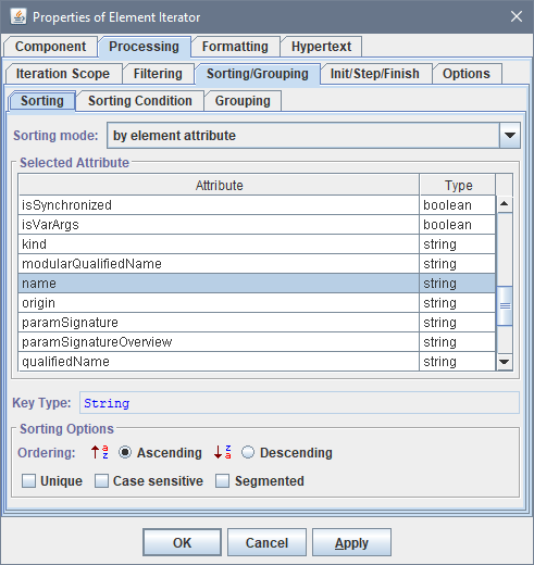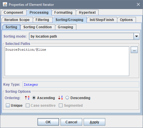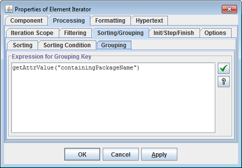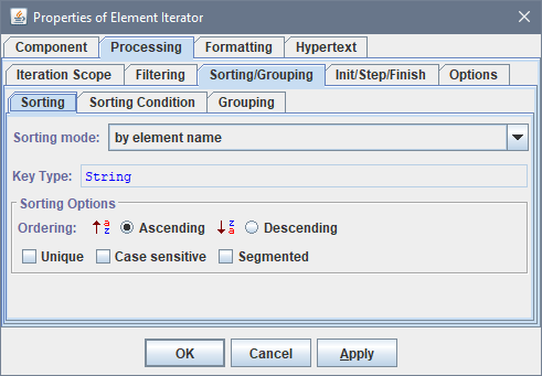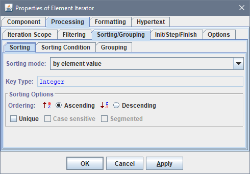 After the initial elements have been collected, filtered and sorted, the result sequence of elements is broken into groups according to the grouping keys generated for each element by the FlexQuery specified in the “Expression for Grouping Key” of the Element Iterator.