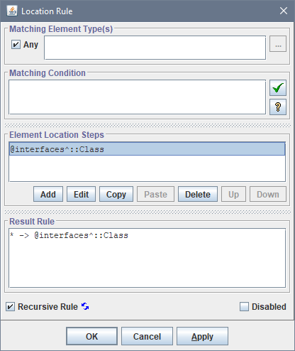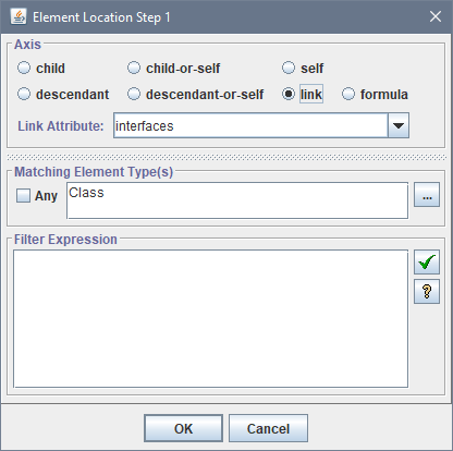 The interpretation of a Location Step consists of taking some initial set of DSM nodes (called step input set) and producing by it another set of DSM nodes (called step result set). How exactly it is done depends on the step's settings (see below). Those settings, in fact, specify how the step is interpreted against only one initial node. The entire result set is produced as a union of the result sets of the step interpretations against every node in the input set.