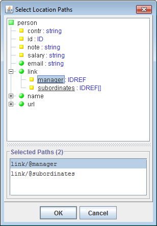 Location Paths are the expressions similar to XPath, which are used in FlexDoc templates to specify the search of elements or attributes.Although eventually they are string, when you design a template in the Template Designer, the Location Paths are normally not needed to be entered directly. Rather, they are constructed using special dialogs or can be selected in the Location Path Chooser, as shown on this screenshot: